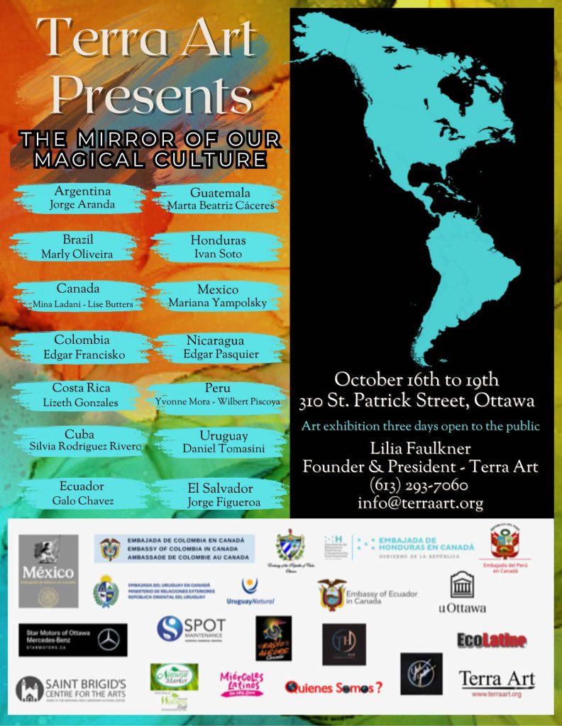 EDICION ESPECIAL XIII Art Of The Americas Exhibition 2025, titulada “THE MIRROR OF OUR MAGICAL CULTURE”. En la celebración del Mes de la Herencia Latina en Canadá, un evento cultural que consiste en Cincuenta Seis obras de arte de dieciséis artistas de los forteos de las Américas. Varios de ellos vienen directamente de sus propios países sólo para esta ocasión.